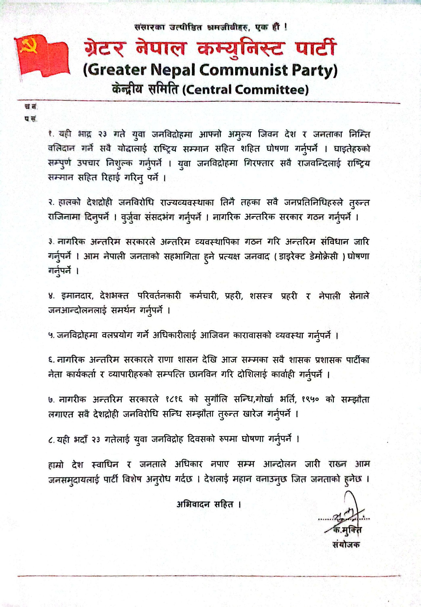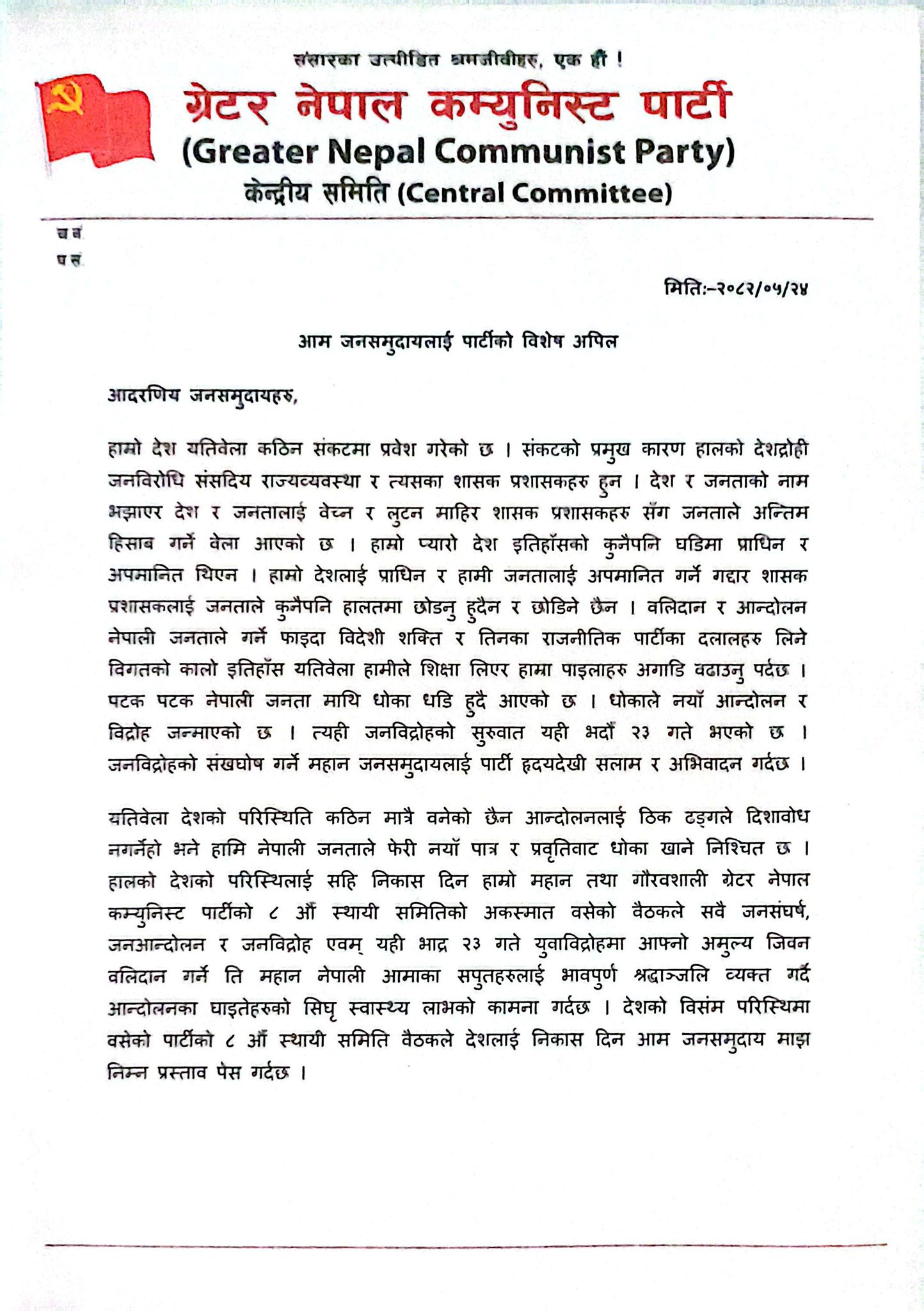नेपाल-यहि भाद्र २३ गते युवा हरुले गरेको शान्तिपुर्ण प्रदर्शनमा सरकारले व्यापक दमन गरेपछी त्यस विरोध यतिवेला देशव्यापी भइरहेको छ । यहि भाद्र २४ गते ग्रेटर नेपाल कम्युनिस्ट पार्टीको आकस्मिक रुपमा वसेको ८ औँ स्थायी समिति वैठकले पछिल्लो चरण विग्रिदो देशको अवस्थालाई निकास दिने गरि आम जनसमुदायलाई ८ वुदे अपिल गरेको छ । पार्टी संयोजक क.मुक्तिको हस्ताक्षर भएको अपिलमा सो विषय सार्वजनिक गरिएको छ । पार्टीले सार्वजनिक गरेको अपिलमा भनिएको छ देश कठिन घडिमा छ । देशद्रोही जनविरोधी शासक प्रशासकले गर्दा देशको अवस्था विग्रिएको अव नेपाली जनताले त्यसको सहि हिसाब गरेर विकल्प खोज्ने वेला भएको वताइएको छ । पार्टीले २३ गतेलाई युवा जनविद्रोह दिवसको रुपमा मनाउन र मृतकलाई राष्ट्रिय शहिद घोषणा गर्नुपर्ने घाइतेको उपचार निशुल्क गर्नुपर्ने । वन्दिलाई सम्मान पुर्वक रिहा गर्नुपर्ने माग गरेको छ । पटक पटक नेपाली जनताले संघर्ष र वलिदान गर्ने तर त्यसको फाइदा विदेशी दलाल र तिनका दलाल राजनीतिक नेताहरुले लिने गरेकाले त्यसवाट सचेत रहन जनतालाई अपिल गरिएको छ । पार्टीले देशलाई पुरै स्वाधिन वनाउन सुगौैली सन्धि गोर्खा भर्ति र १९५० को सम्झौता लगाएतका सवै देशद्रोही जनविरोधि सन्धि सम्झौता तुरुन्त खारेज गर्नुपर्ने वताएको छ । देशलाई तत्काल निकास दिन पार्टीले नागरीक अन्तरीम सरकार घोषणाको माग गरेको छ । युवा जनविद्रोहमा उठेको मुख्यमाग जनताको प्रत्यक्ष शासन भएकाले पार्टीले मौजुदा संसदिय राज्यव्यवस्थाको विघठन गरेर जनताको प्रत्यक्ष जनवादी राज्यव्यवस्था गठन गर्नुपर्ने वताएको छ । राणा शासन देखी यताका सवै शासक प्रशासक नेता कार्यकर्ता र व्यपारीहरुको सम्पत्ति छानविन गरि राष्ट्रिय करण गर्नुपर्ने उल्लेख गरेको छ। देश र जनता पुर्ण स्वाधिन नभए सम्म आन्दोलन जारी राख्न पार्टीले आम जनसमुदायलाई विशेष अनुरोध गरेको छ ।